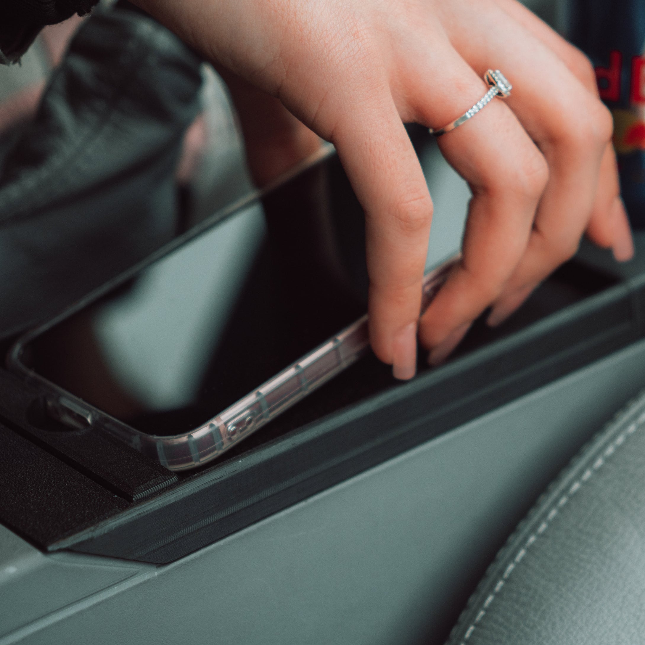 In addition to charging, the module includes a built-in drink holder for cans or bottles up to 500 ml (68 mm diameter). Its ergonomic placement ensures stability and easy access — keeping your beverage safe while driving.